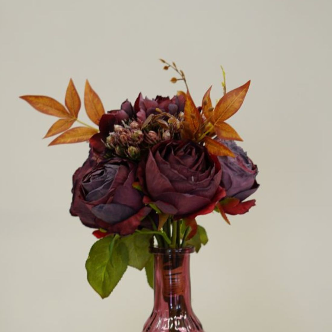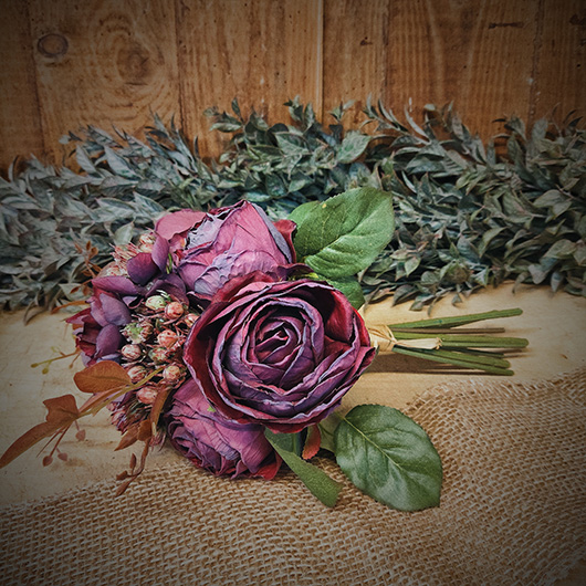 De kleur van de meeste bloemen in dit boeket is diep donker roodpaars. Het boeket is ongeveer 30 cm hoog