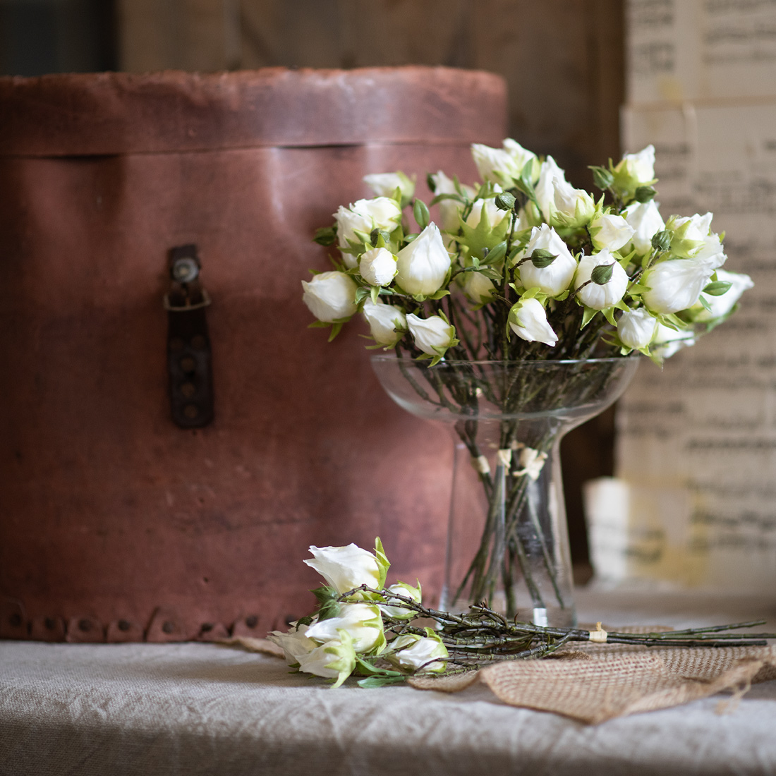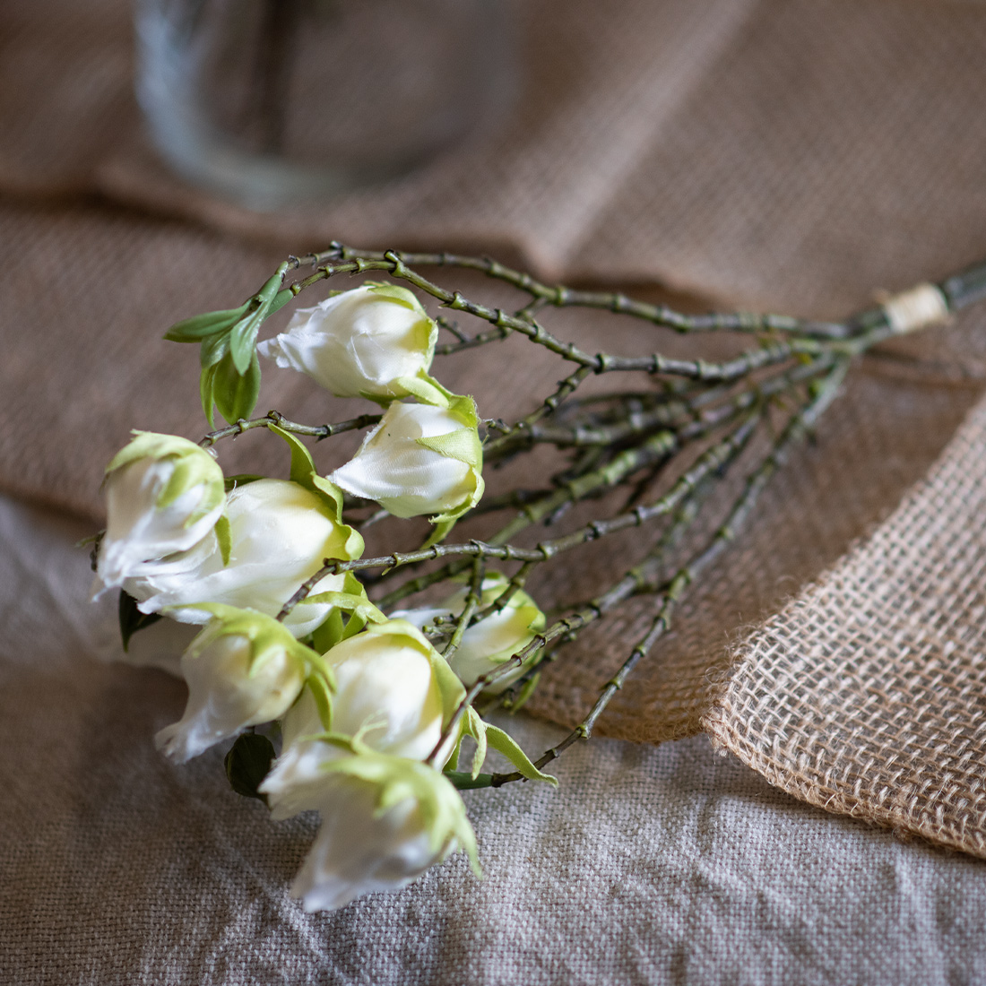 Frisgekleurde bloemen, wit met een puntje frisgroen. De bos heeft drie takjes en in totaal 9 bloemen. Op de foto zitten de trossen in een glazen vaas, meerdere trossen. Natuurlijk ook prachtig om te gebruiken in een gemengd boeket. Ze zijn ongeveer 34 cm lang.